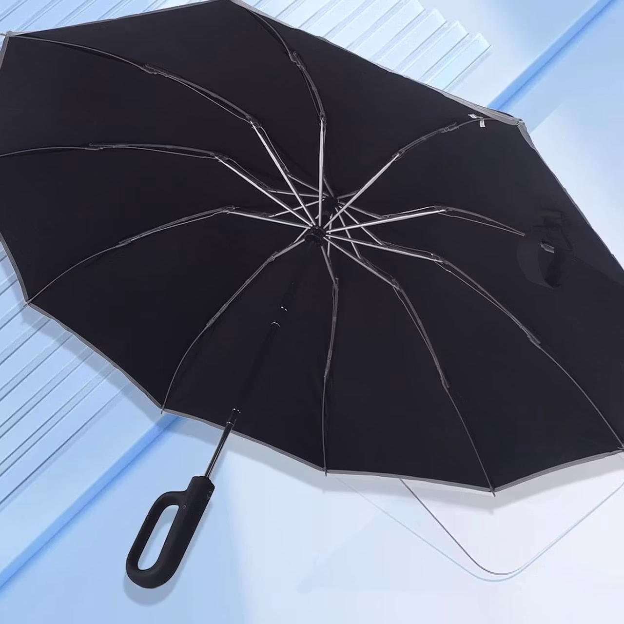 Entdecken Sie unseren robusten Regenschirm Robust, der für Stil und Funktionalität entworfen wurde. Mit einer kraftvollen Konstruktion aus Stahl und Glasfaser hält er starken Winden von bis zu 60 km/h stand. Die automatische Öffnungsfunktion macht die Verwendung einfach, während das umgekehrte Design Sie und Ihre Habseligkeiten trocken hält. Ein reflektierender Rand rund um den Schirm sorgt dafür, dass Sie sowohl im Regen als auch im Dunkeln sichtbar sind, was zusätzliche Sicherheit bei nächtlichen Spaziergängen bietet.