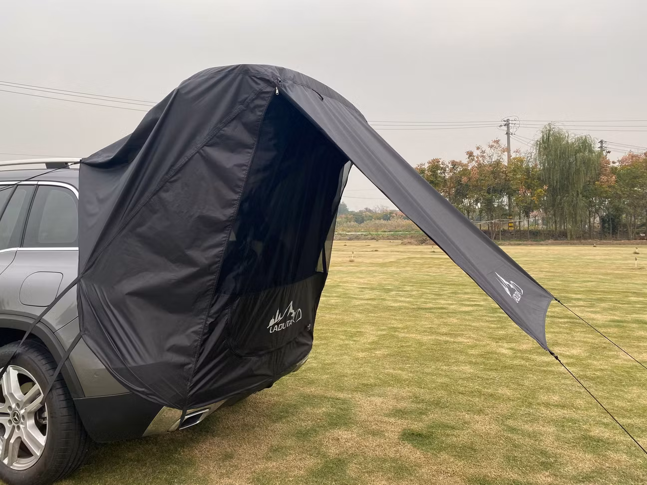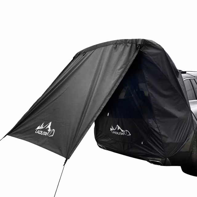 Mit diesem strapazierfähigen, wetterfesten Reisevorzelt sind Sie sowohl vor Sonne als auch vor Regen geschützt. Das Zelt wird mit elastischen Bändern rund um die Rückseite/Heckklappe des Fahrzeugs befestigt.