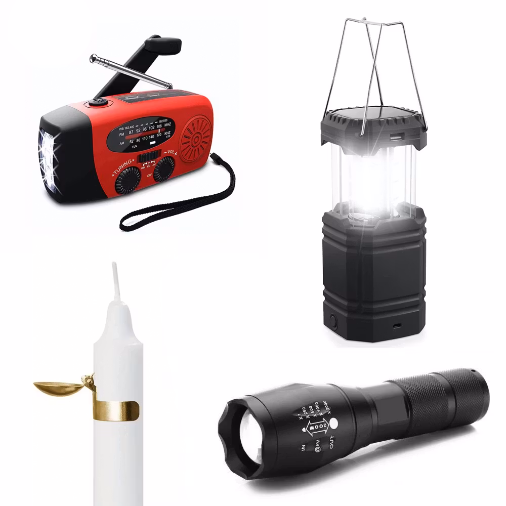 Das Herbst- und Winterpaket enthält 4 der wichtigsten Produkte, die du im Falle einer Krise zu Hause haben solltest: ein Kurbelradio, Kerzenlöscher, eine Lampe und eine Taschenlampe.