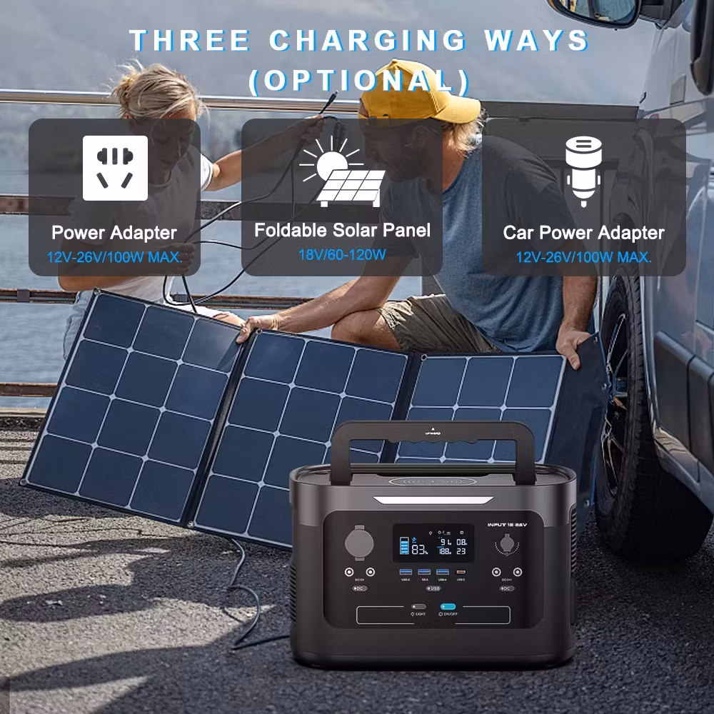 | Weitere Merkmale | Batteriemanagementsystem, Überspannungsschutz, Überlastschutz, Überhitzungsschutz, Kurzschlussschutz, Niedrigtemperaturschutz, Niedrigspannungs-schutz, Überstromschutz Ladezeiten: Steckdose (230 V AC): 1,6 Stunden. 12/24 V Auto-Adapter: 10-12 Stunden. 110 W Solarpanel bei voller Sonne: 4-8 Stunden. 3x160W Solarpanel bei voller Sonne: 3,5-7 Stunden |
