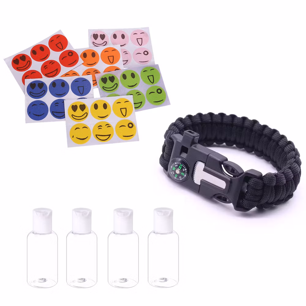 Det perfekta paketet för sommaren! Vårt lilla sommarpaket innehåller klistermärken som håller myggen borta, fyra små reseflaskor som är perfekt att ha med sig på resan och ett överlevnadsarmband med inbyggt tändstål, kompass och visselpipa.