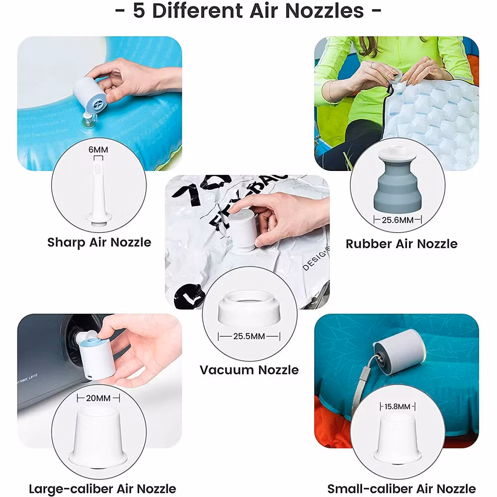 Diese vollständig elektrische Luftpumpe wird mit 5 Düsen geliefert, die einfach eine Vielzahl von Gegenständen wie Matratzen, aufblasbare Möbel und große aufblasbare Betten aufpumpen. Die Luftpumpe verfügt außerdem über eine LED-Lampe an der Unterseite, deren Helligkeit von 40 lm auf 400 lm eingestellt werden kann.