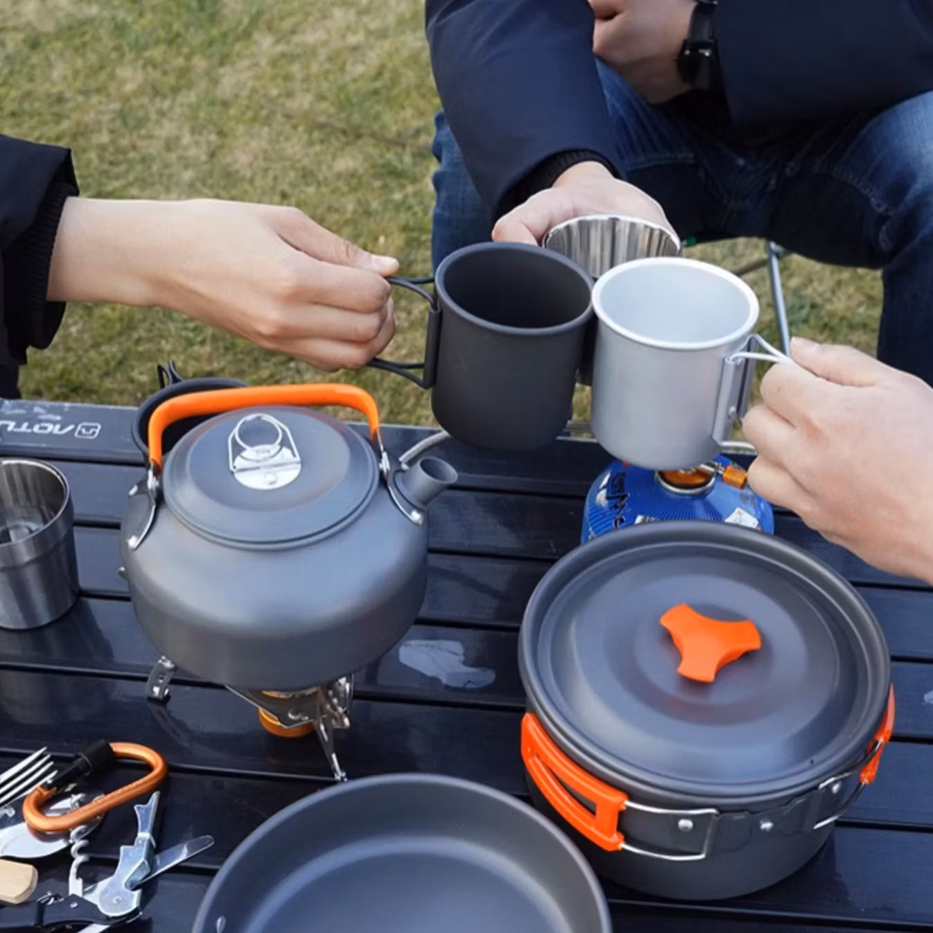 Das Set enthält ein vollständiges Besteckset, 2 Aluminiumbecher, einen Topf und eine Bratpfanne.