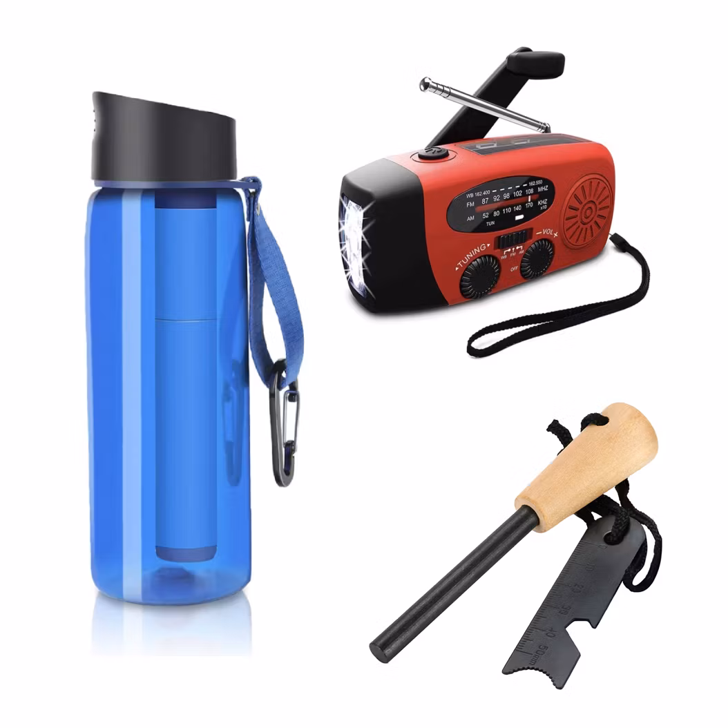 Das Schweden-Paket enthält 3 der wichtigsten Produkte, die du in deinem Zuhause im Krisenfall haben solltest: ein Kurbelradio, eine Flasche mit eingebautem Wasserreinigungsfilter und einen Feuerstahl.