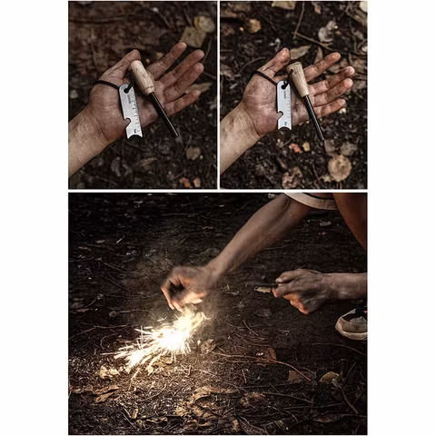 Robuster Feuerstahl mit Holzgriff. Mit dem beiliegenden Metallblatt oder einem Messer kann man Funken erzeugen, um leicht entzündbares Material zu entzünden.