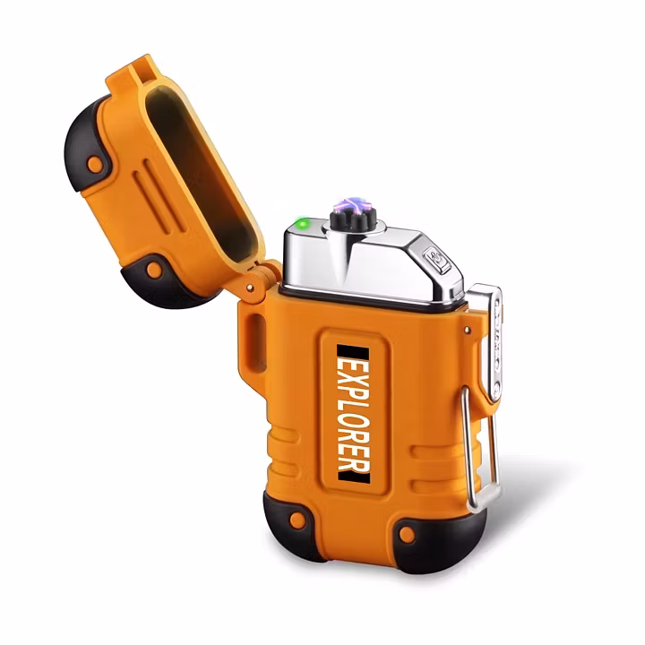 Orangenes Feuerzeug, das mit einem extrem heißen elektrischen Lichtbogen statt mit Feuer zündet. Der eingebaute Akku wird über USB aufgeladen, sodass das Feuerzeug niemals leer wird.